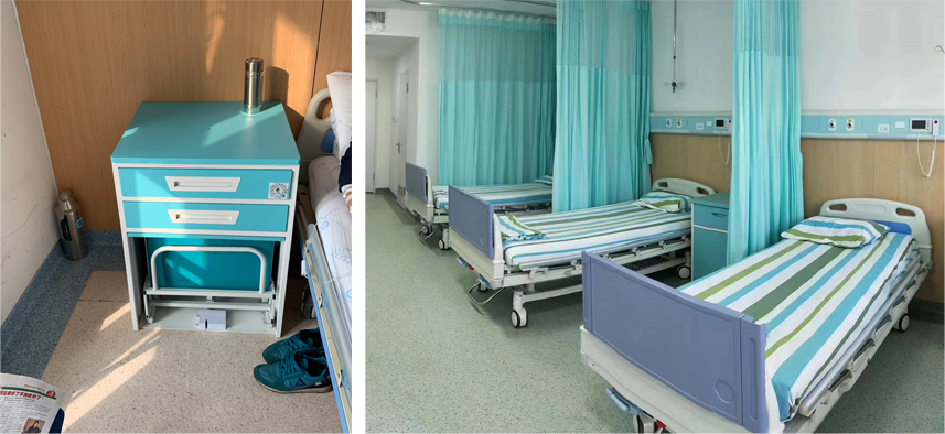 2.節(jié)省空間:閑置時(shí)段以床頭柜形態(tài)存在病房,可當(dāng)做柜子放置小型雜物,抽屜可放置病患材料。