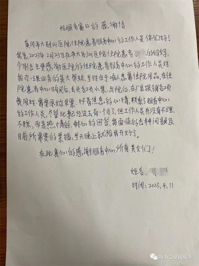 近日,一位患者家屬將一封特別的感謝信親自送到了黃岡市中心醫(yī)院住院患者服務(wù)中心。胡阿姨講道:她家人在黃岡市中心醫(yī)院住院時(shí),住院患者服務(wù)中心窗口工作人員耐心的解答她的各項(xiàng)問題,并協(xié)助她辦理了入院手續(xù),還將她需要的緊急入院用品親自送到了病房,在事后的一個(gè)多月,她再次來到了我們服務(wù)中心,希望我們幫助找尋丟失小票,及給她開具相關(guān)發(fā)票,我們窗口客服依然耐心的幫助她查找記錄,并及時(shí)給她開具了發(fā)票。本是一件很小的事情,沒想到她今天卻坐了一個(gè)小時(shí)的公交車,親自將這封感謝信送到了我們手上。